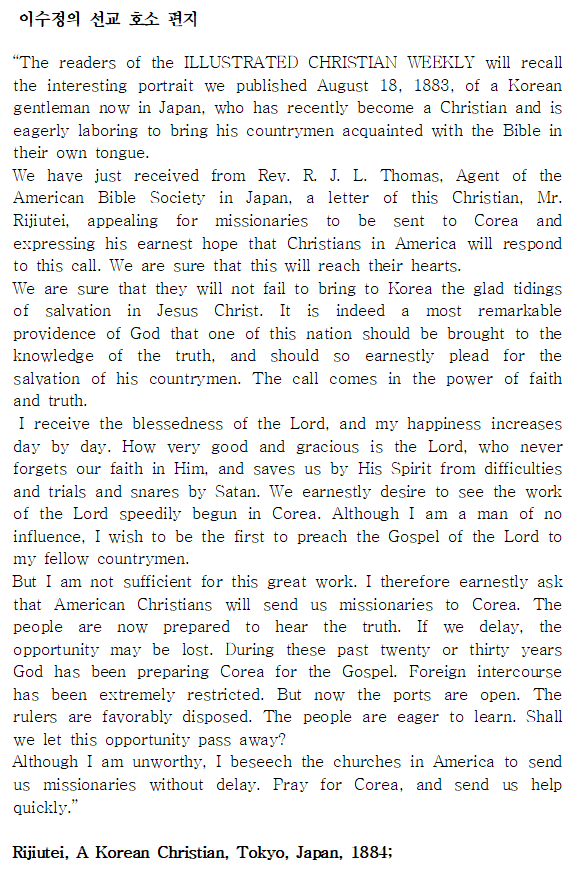 바로 이 조선인 크리스찬 Mr. Rijutei(이수정의 일본 발음)가 쓴 편지를 받았습니다.